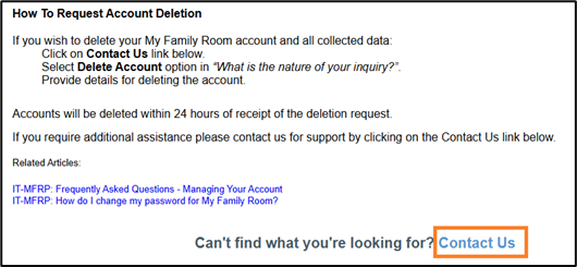 5- You'll be prompt to complete the request out for deleting your my family room account. 6- Keep in mind that we'll be sending you an email to confirm you wanted to delete your account. Accounts will be deleted within 24 hours of receipt of the deletion request.