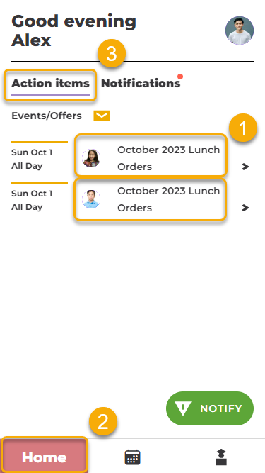 You can find any Events (1) available to be accepted or paid for in the Home (2) section, under the Action items (3) on the My Family Room website or apps.
