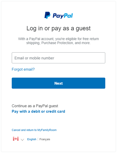 To use the Online Payments features, all you need is an accepted payment method. My Family Room uses PayPal to process your transactions, we recommend you use a free PayPal account which is linked to at least one funding source, such as a bank account or credit card to process these transactions, however, you can continue as a guest without creating a PayPal account.